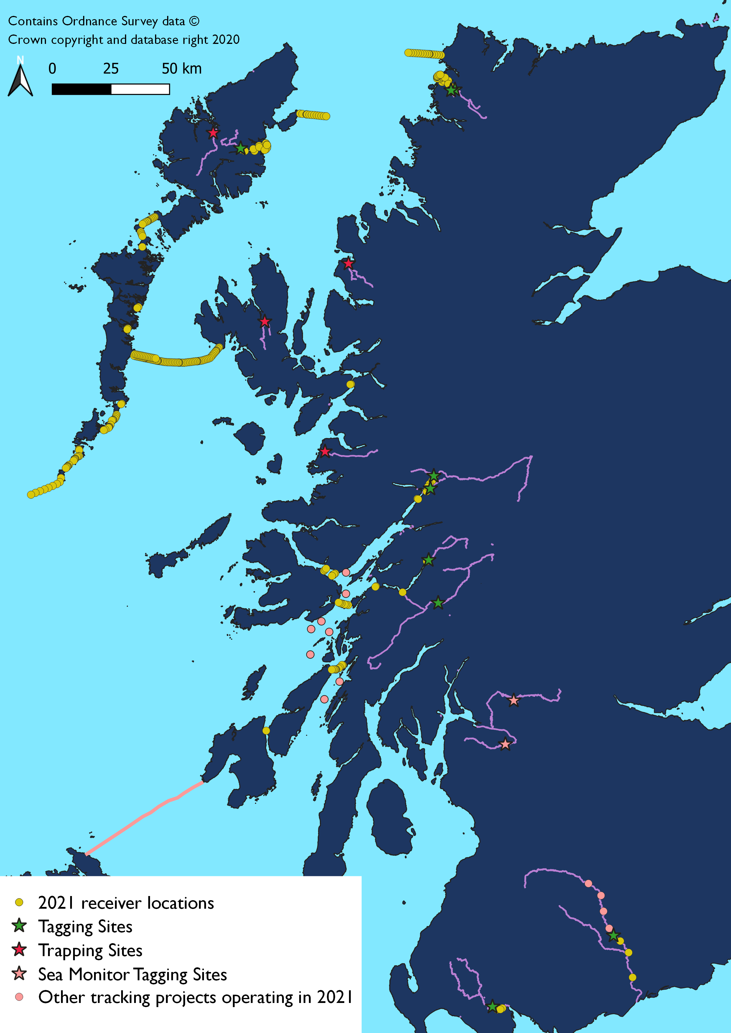 Earlier this Spring, 24 in-river receivers and 228 marine receivers were deployed from the northwest coast of Scotland, around the Western Isles, all the way down to Dumfries and Galloway. This momentous task could not have happened without the wealth of help & support from our incredible project partners, Boards & Trusts and the determined individuals who dedicated their time to make this project happen.